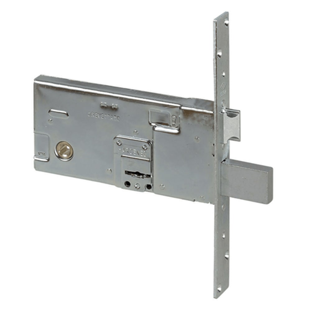 Serratura a doppia mappa, da infilare, per serramenti metallici. Chiusura laterale con scrocco reversibile + catenaccio a 4 mandate. Frontale mm.240 x 25 x 3 Scatola mm.165 x 82 Entrata mm.70 Scrocco reversibile (per chiusura sia a destra che a sinistra). Richiamo scrocco con chiave o con maniglia con quadro mm.8 Scatola, frontale e catenaccio in acciaio con rivestimento in zinco. Fornita con 2 chiavi e viti di fissaggio. Protezione antitrapano.