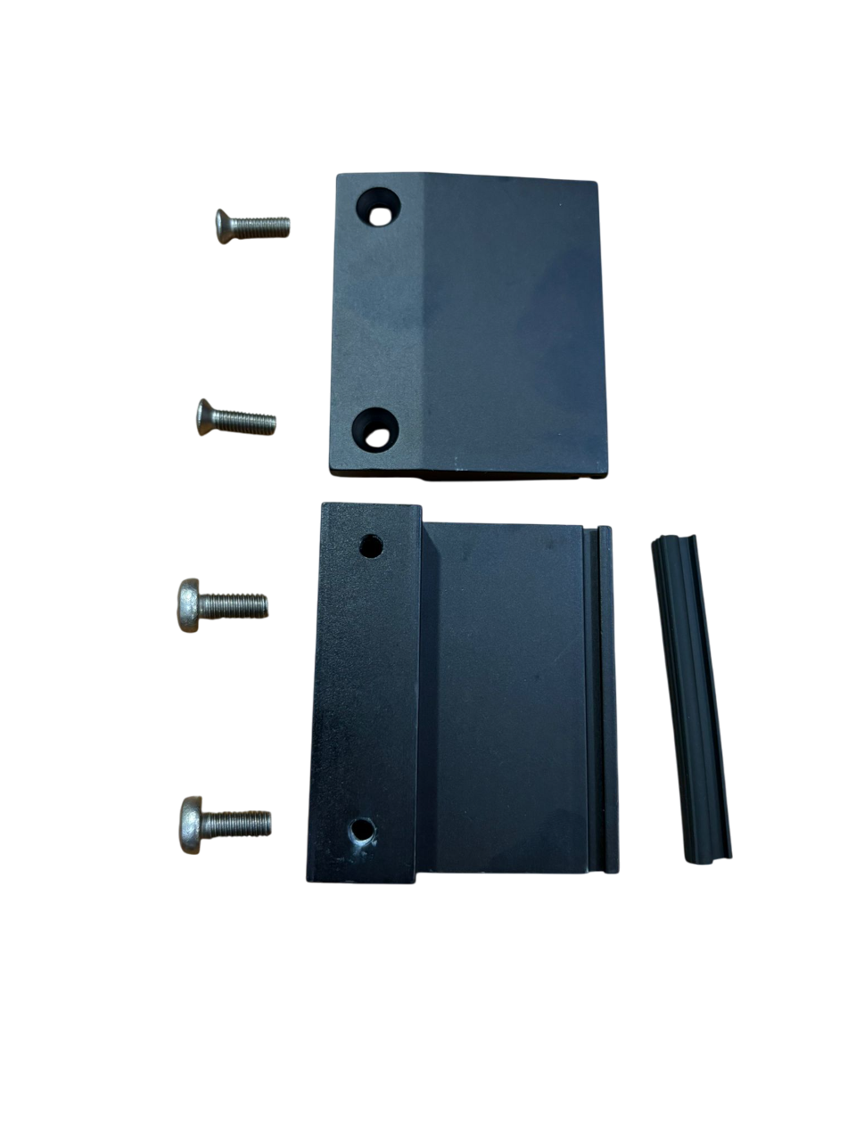 2 viti T.C. M6x14 e n. 2 viti T.S.C. M5x16 in acciaio inox. Guarnizione in giprene nero per spessore vetro mm 8+8,76.