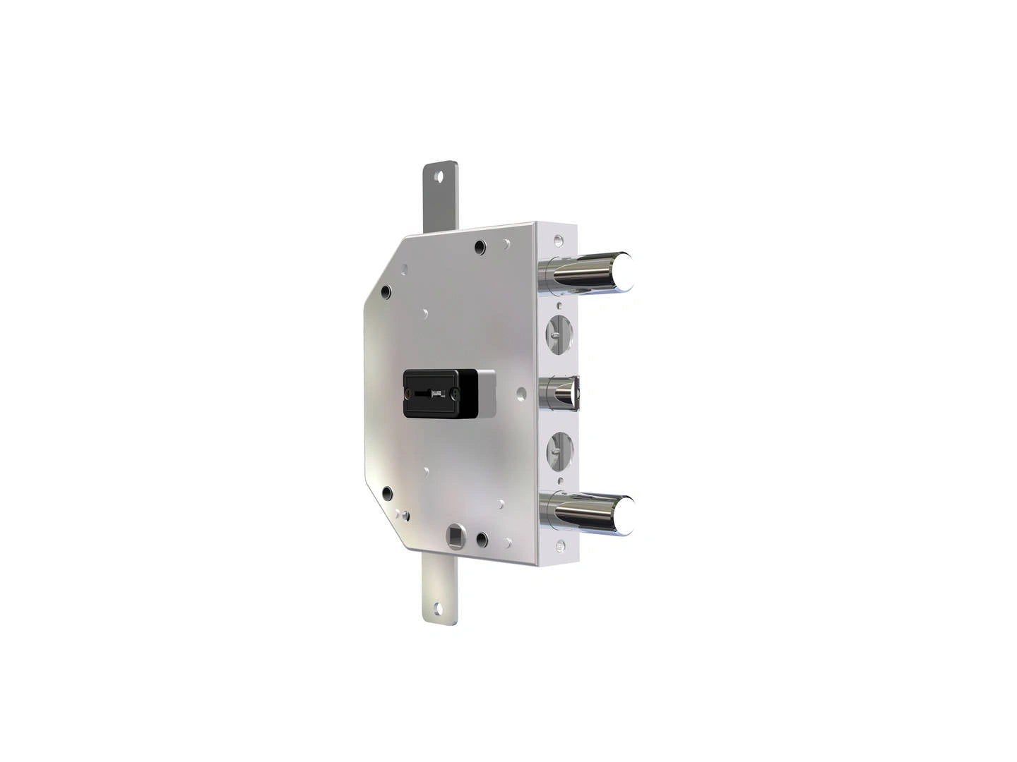 DESCRIZIONE: Serratura a doppia mappa per porta blindata con 3 punti di chiusura. Con scrocco. Applicazione a planare, fissaggio senza testata.  2 catenacci con interasse 56 mm. Zincata.