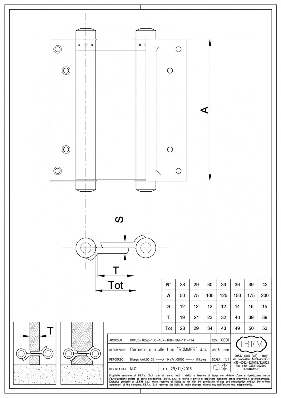 Cerniere a molla doppio effetto da installare su aperture in legno, metallo o alluminio, mezze ante e ante complete. Questo modello, grazie alle sue dimensioni, è particolarmente indicato per ante in legno. Queste cerniere permettono l'apertura delle ante in entrambe le direzioni: verso l'interno e verso l'esterno. Assicurano inoltre la chiusura della porta dopo il passaggio per facilitare il passaggio di persone o materiali Per ottenere una maggiore portata è possibile utilizzare più di una coppia di cerniere, prestando attenzione alla loro spaziatura verticale, allineamento e regolazione. Su queste cerniere è possibile regolare la forza di chiusura agendo sul tensionamento della molla interna, come riportato nelle nostre istruzioni prodotto.
