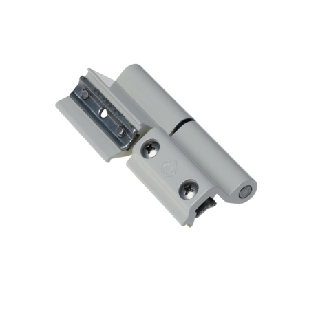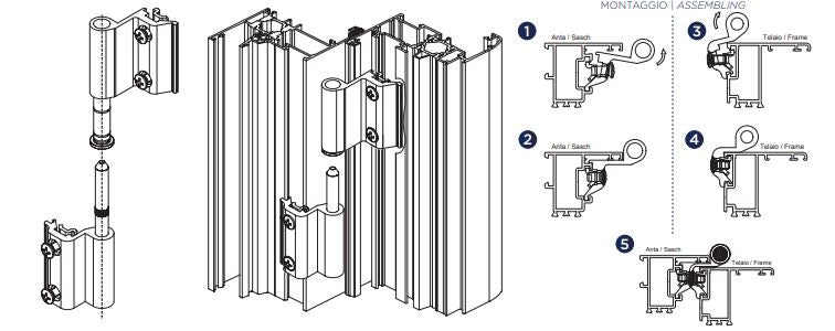 Corpo base cerniera, carter in alluminio estruso. grani di fissaggio in Acciaio Inox AISI 303. Grano di regolazione in Acciaio Zincato. Boccole in Zama. Boccole in Derlyn. Tappi cerniera in materiale plastico (Nylon Pa6). Cerniera per porte a 3 ali, interasse 60 mm