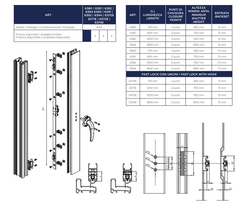 Master Chiusura multipunto a montaggio rapido per scorrevoli FAST LOCK con incorporato il dispositivo di movimentazione L 1800 mm - 3 punti di chiusura - Entrata 7,5 mm