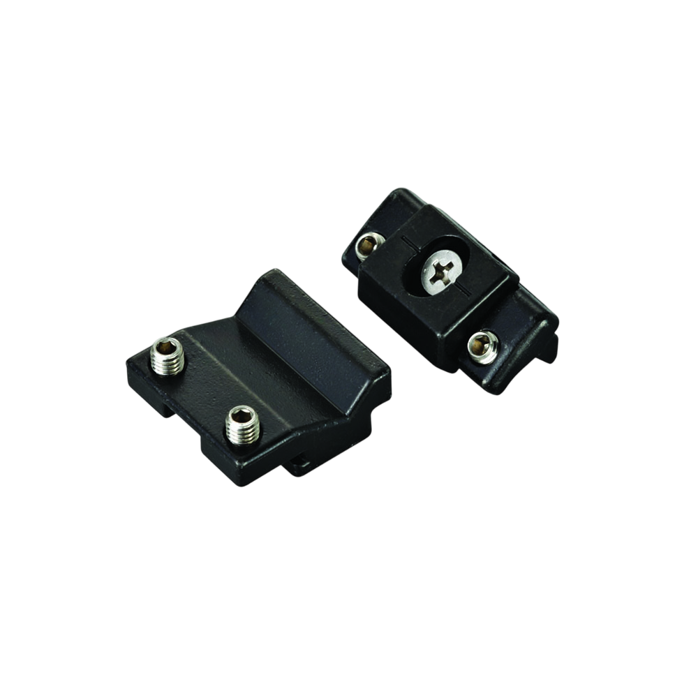 Chiusura supplementare lato cerniere in zama zincata nera, 1 tappo in poliuretano, 2 boccole Ø 6÷8 in nylon e 1 grano M5x10 in acciaio inox 304.