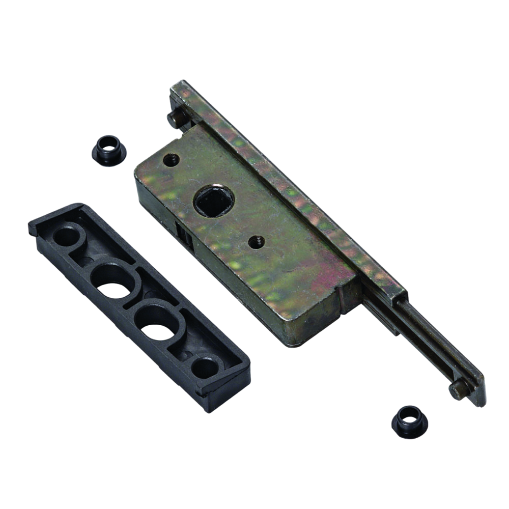 Movimento monodirezionale con entrata di 16 mm per anta-ribalta, in zama zincata nera, foro quadro di 7 mm, boccole di maggiorazione Ø 6-Ø 8 mm in nylon.