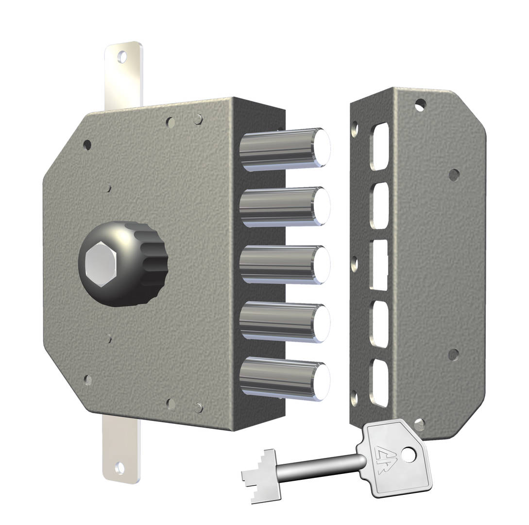 DESCRIZIONE: Serratura a pompa per porta in legno con 3 punti di chiusura. Senza scrocco. 5 catenacci con interasse 28 mm. Verniciata.