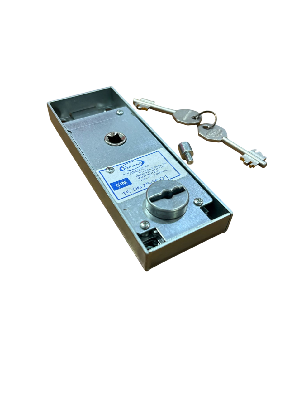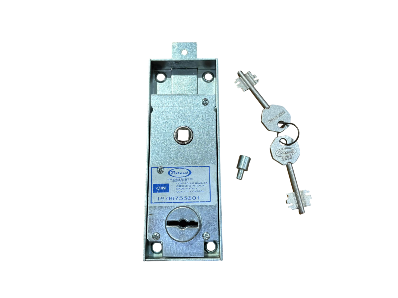 Serratura a doppia mappa a 1 punto di chiusura. 6 leve asimmetriche con catenacci diritti. Quadro maniglia 8 mm. 2 chiavi in dotazione