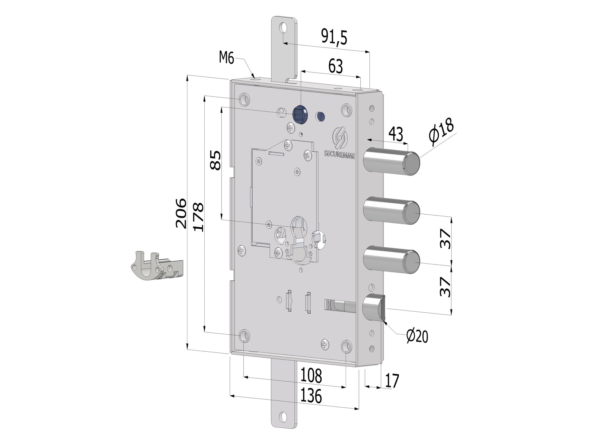 Soddisfa il massimo grado 7 secondo la norma UNI ENV 12209:2005 in abbinamento alla piastra di protezione art. 7165XAC10. Chiusura triplice a cilindro europeo, 4 mandate corsa 40 mm e scrocco. Fissaggio cilindro C con aletta Securemme. Fissaggio serratura planare con 4 bussole e laterale con 4 viti M6. Fori passanti interasse 38 mm per fissaggio Protector e rosetta maniglia. Finitura zincata con 4 catenacci Ø18 mm in acciaio cromato. Scrocco Ø20 mm reversibile in acciaio cromato per porte sinistre a tirare o spingere. A serratura chiusa la maniglia non sgancia lo scrocco. Confezione singola in scatoletta.