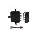 Entrata costruttiva 64 mm; Scatola e bocchetta in acciaio verniciato color bronzo antico metalizzato. Solo catenacci a 4 pistoni in acciaio nichelato. Canotto guida chiave esterna. Protezione al grimaldello della leva scrocco.