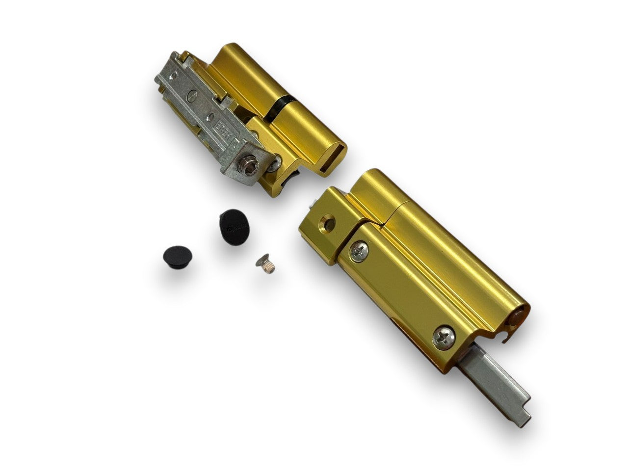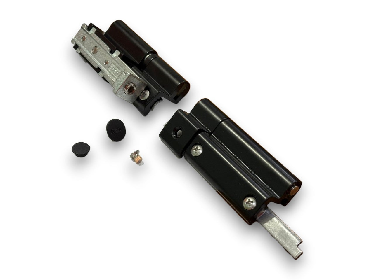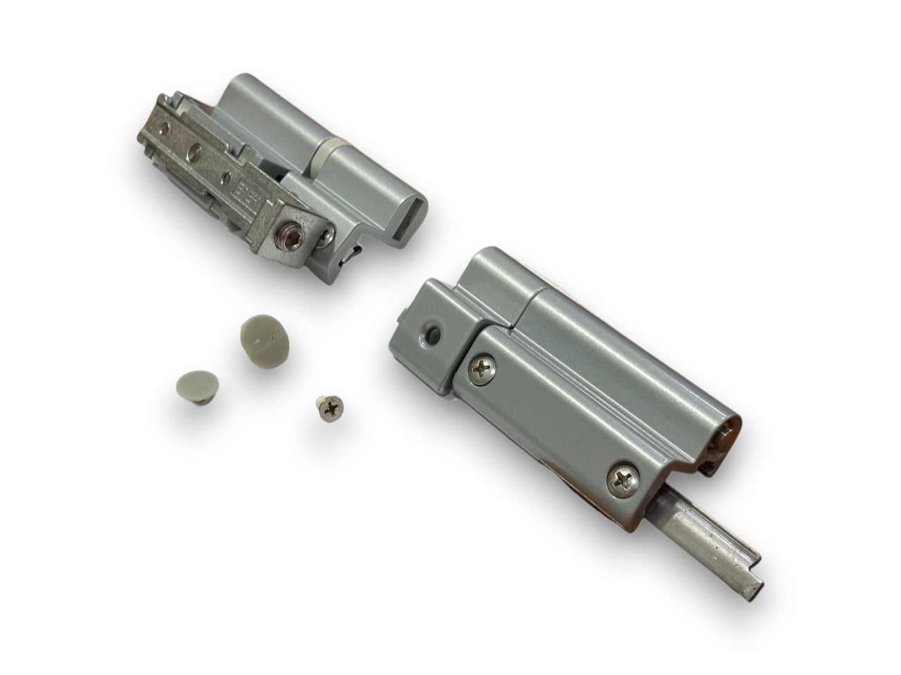 La cerniera inferiore è realizzata interamente in alluminio estruso. Il fissaggio al telaio avviene tramite una contropiastra d' acciaio inox già premontata, mentre sull'anta l'aggancio s'effettua per mezzo di una contropiastra di zama zincata. Possibilità di regolazione micrometrica tridimensionale in senso orizzontale (+/-1mm), verticale (-1,+2mm) e in pressione (-0,6,+0,6mm). La cerniera superiore è realizzata interamente in alluminio estruso e l'aggancio al telaio avviene tramite una contropiastra d' acciaio inox già premontata. Anche il perno di rotazione è d'acciaio inox ed è bloccato da un grano per evitarne lo sfilamento accidentale.