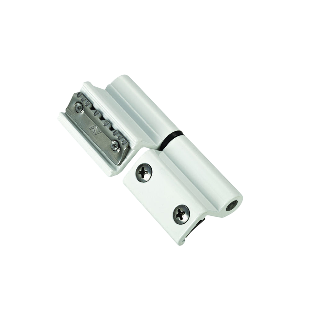 DESCRIZIONE: Cerniera a 2 ali in alluminio, boccola in nylon, perno, contropiastre e 4 viti TSC M5x10 premontate in acciaio inox 430. Portata: 2 cerniere Kg. 80, 3 cerniere Kg. 90