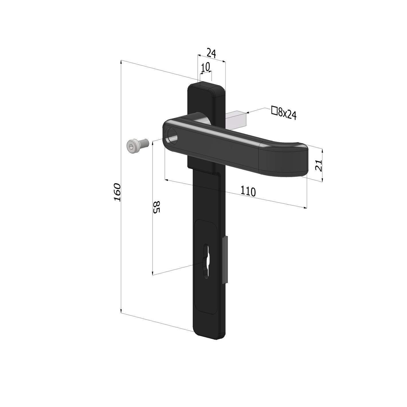 Mezza maniglia per persiane e grate da 110 mm per chiavi a Doppia Mappa dimensioni 24x160 mm interasse 85 mm e Q8x25 mm in nylon nero.